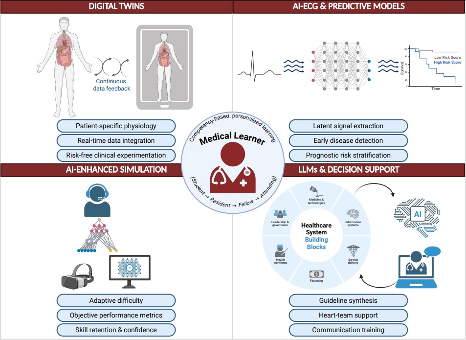 Artificial intelligence (AI) is rapidly reshaping medical education by transforming how knowledge is generated, skills are acquired, and clinical competence is assessed. As AI becomes embedded in routine clinical practice, traditional apprenticeship-based training models are increasingly strained by rising patient complexity, expanding medical knowledge, and heightened safety expectations. This review provides an integrated perspective on the educational impact of contemporary AI technologies, including digital twins, deep learning–enabled electrocardiography, AI- enhanced simulation, and large language model–based clinical decision support. These tools enable personalized, competency-based learning at scale, offering high-fidelity, data-driven environments for risk-free experiential training, prognostic reasoning, and procedural skill development.